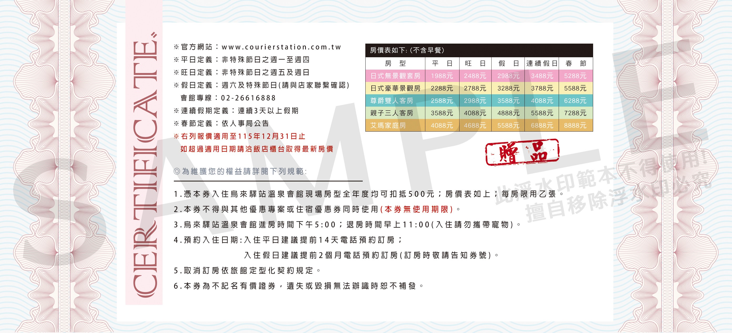 ※不分平假日持券入住可享最高500元之房價折扣(房價與相關規範請見以下票券樣張)